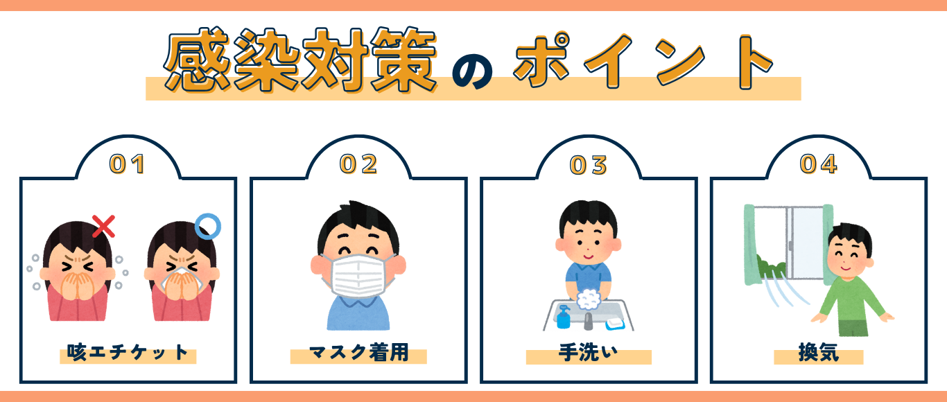 手洗い・咳エチケット・換気などの基本的な行動のほか、