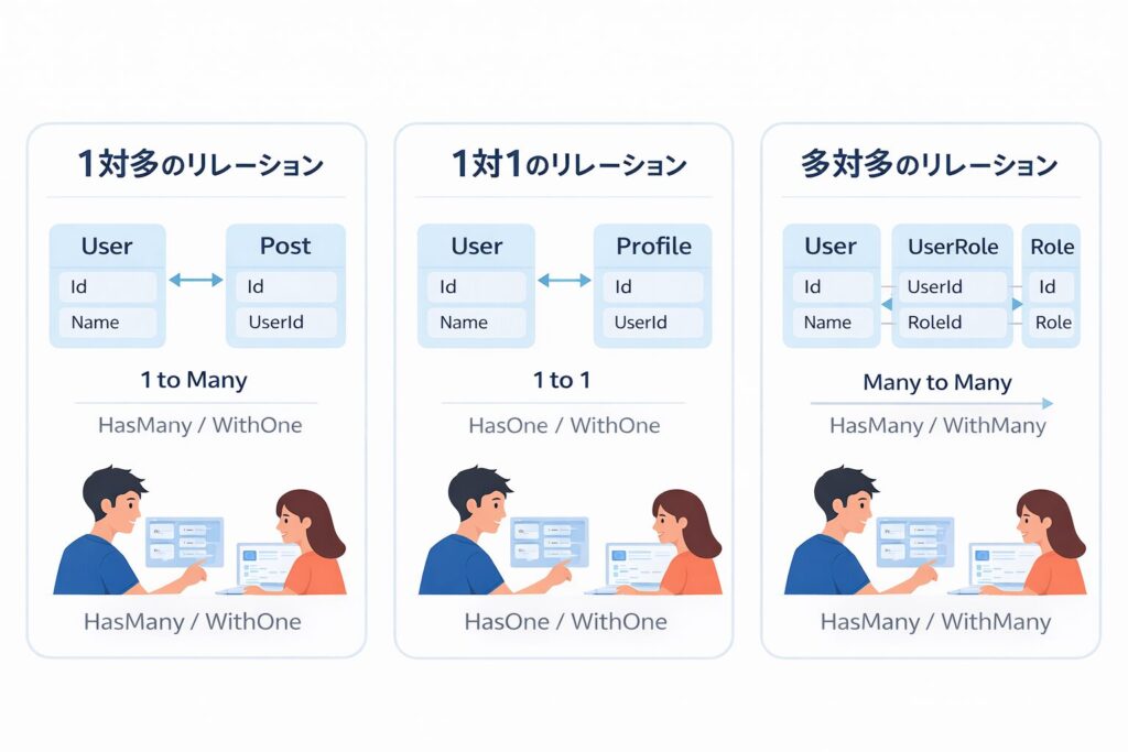 HasMany / WithOne などで、規約の解釈を 明示的に固定・上書き できます。