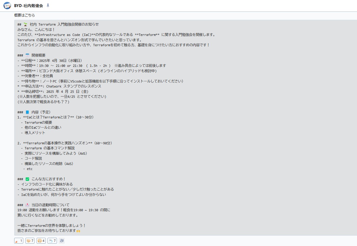 Now, this time we held an introductory study session for Terraform, which was requested by our internal members, so we would like to report on it and look back on it.