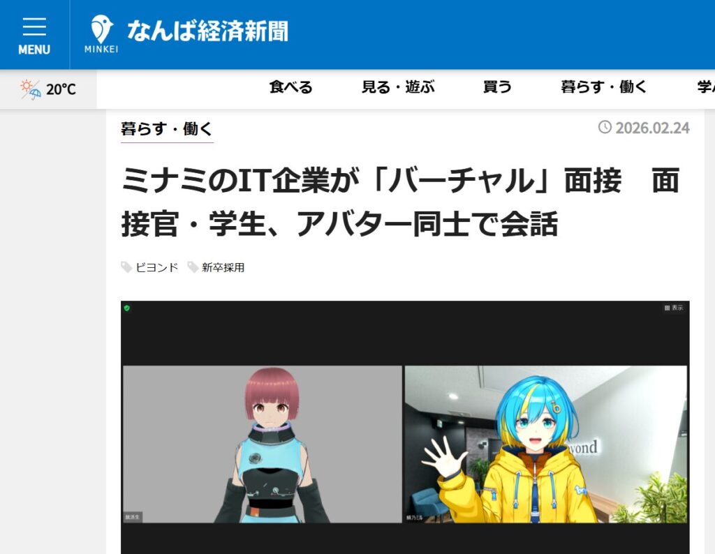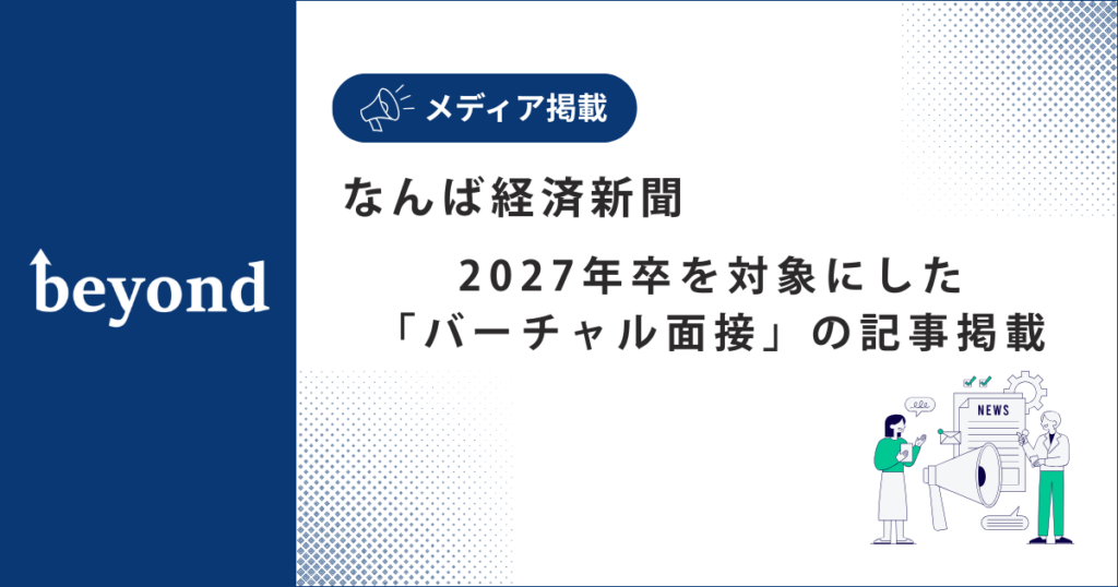 "Virtual Interviews" for job-seekers featured in Namba Keizai Shimbun 2026.02.24 news An article about Beyond Inc.'s "virtual interview" initiative was published in the Namba Keizai Shimbun, run by Lapre Inc Publication details Name of media (media name) Namba Economic Newspaper Operating company Lapre Co., Ltd Contents "Virtual interviews" for new graduate recruitment Published article URL https://namba.keizai.biz/headline/5795/ [Press Release] It's that time of year again! The annual "Virtual Interview" for job-seekers is being held Recommended Articles Recommendation [Media Coverage] "AI & Virtual Interviews" featured on Ledge.ai news [Media Coverage] "Virtual Interview" featured in @Jinji news