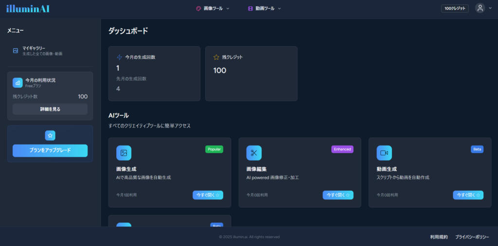 付与される20クレジットでは、最大10枚の画像生成、最大2本の動画生成が可能です。これは、同種の競合サービスにおける無料プラン(画像生成3〜6枚、動画生成1本程度)と比較しても、十分に実用的なボリュームとなっています。フリープランの段階から制作フローやアウトプット品質をしっかりと確認できるため、本格導入前の検証にも適しています。