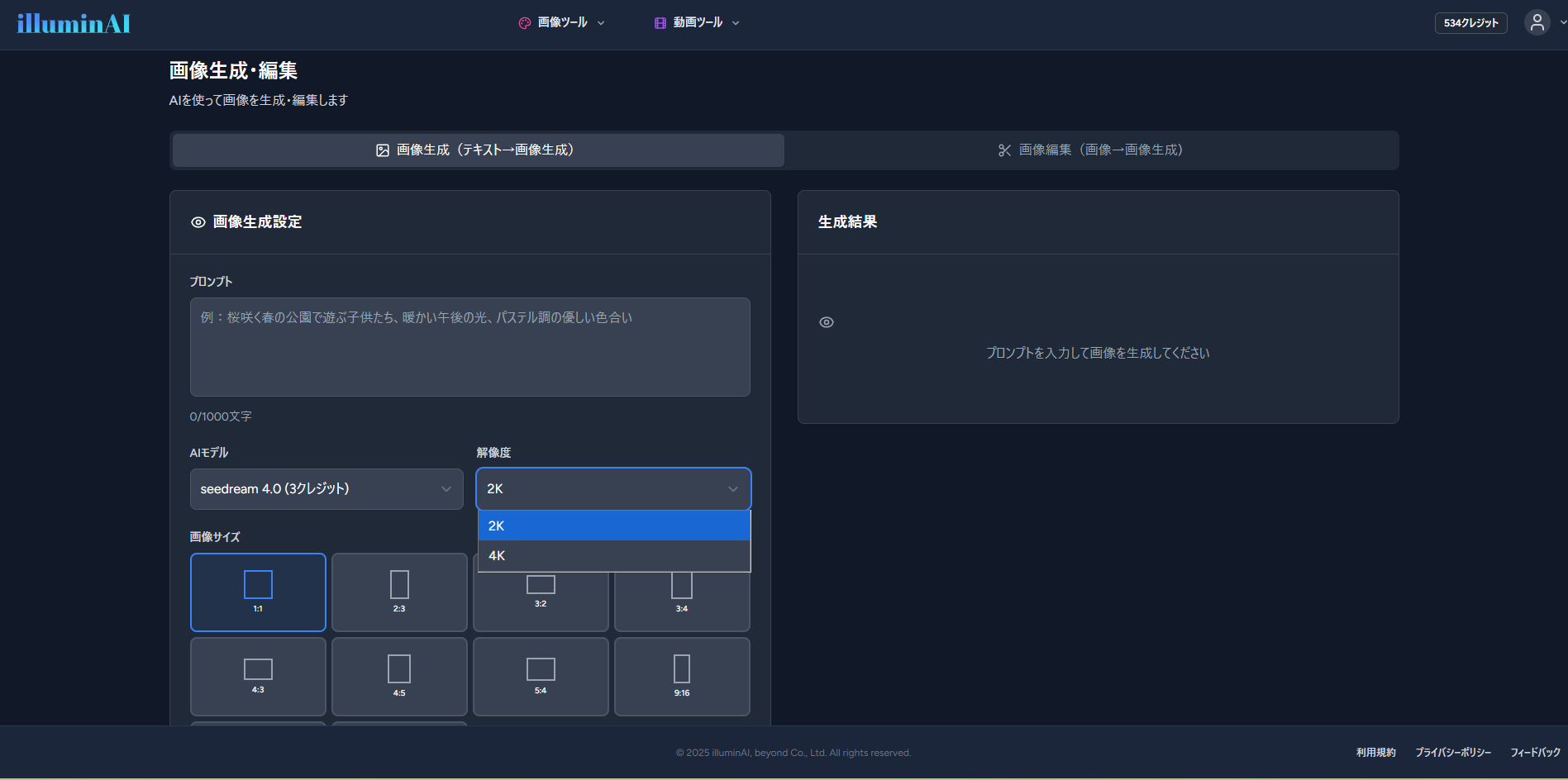 Seedream 4.0モデルにおいて、2K・4Kの高解像度の指定に対応しました。